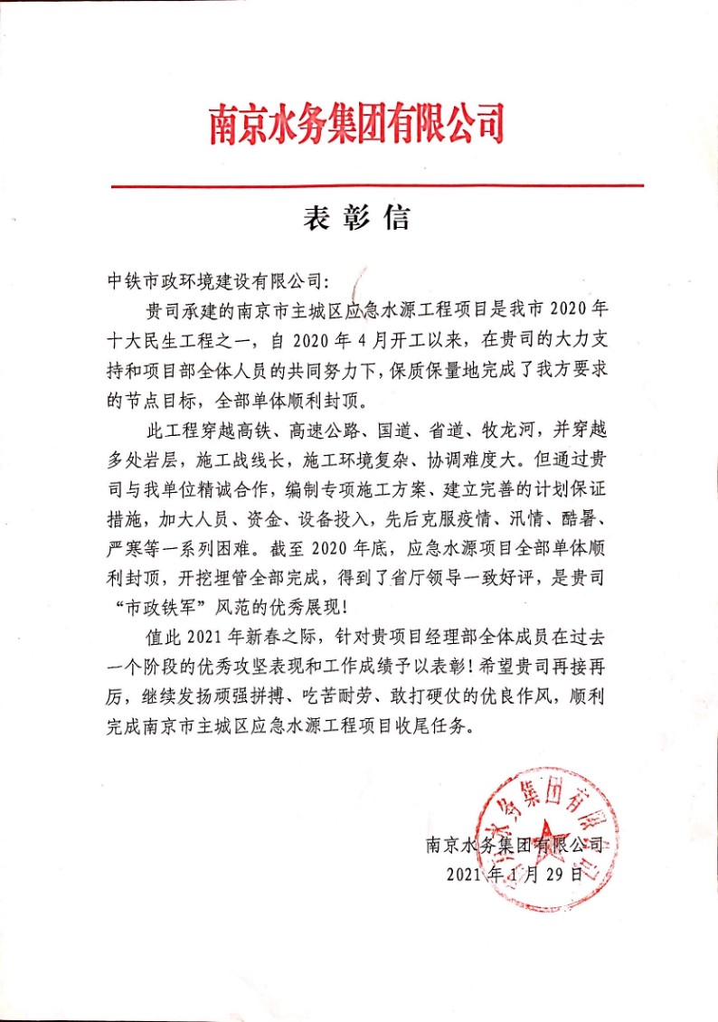 近日,湖北省總工會發布《關于對2020年全省勞動競賽先進集體和先進個人授予湖北五一勞動獎的通報》,公司武漢黃家湖污水處理廠三期擴建工程項目部榮獲“2020年湖北省勞動競賽先進班組”,斬獲“湖北省工人先鋒號”殊榮,并收到武漢三鎮實業控股股份有限公司發來的賀信。...