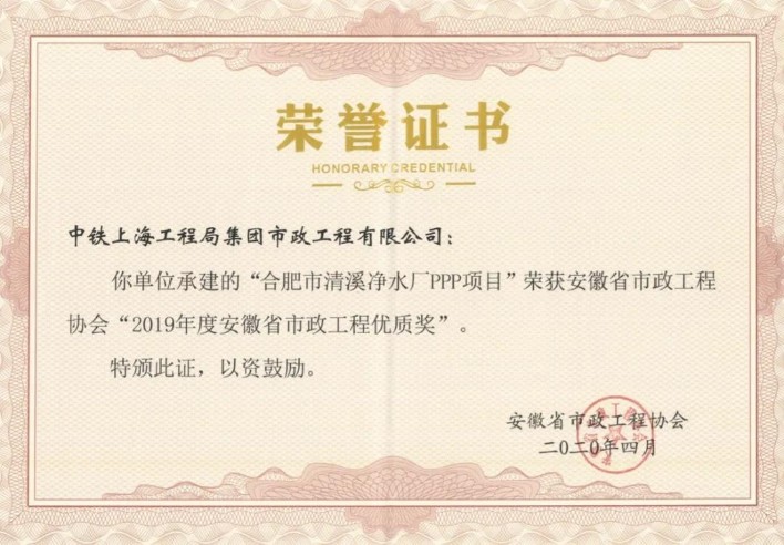 近日,安徽省市政協(xié)會(huì)傳來喜訊,公司承建的合肥市清溪凈水廠PPP項(xiàng)目榮獲安徽省市政工程優(yōu)質(zhì)獎(jiǎng)