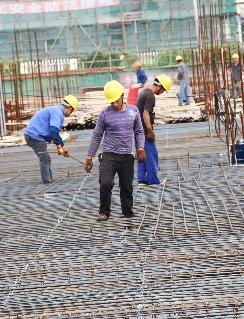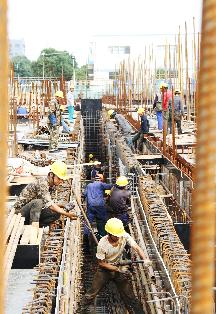 2015年9月25日拍攝,在昆山北區污水廠三期擴建工程施工現場工人們正在作業。